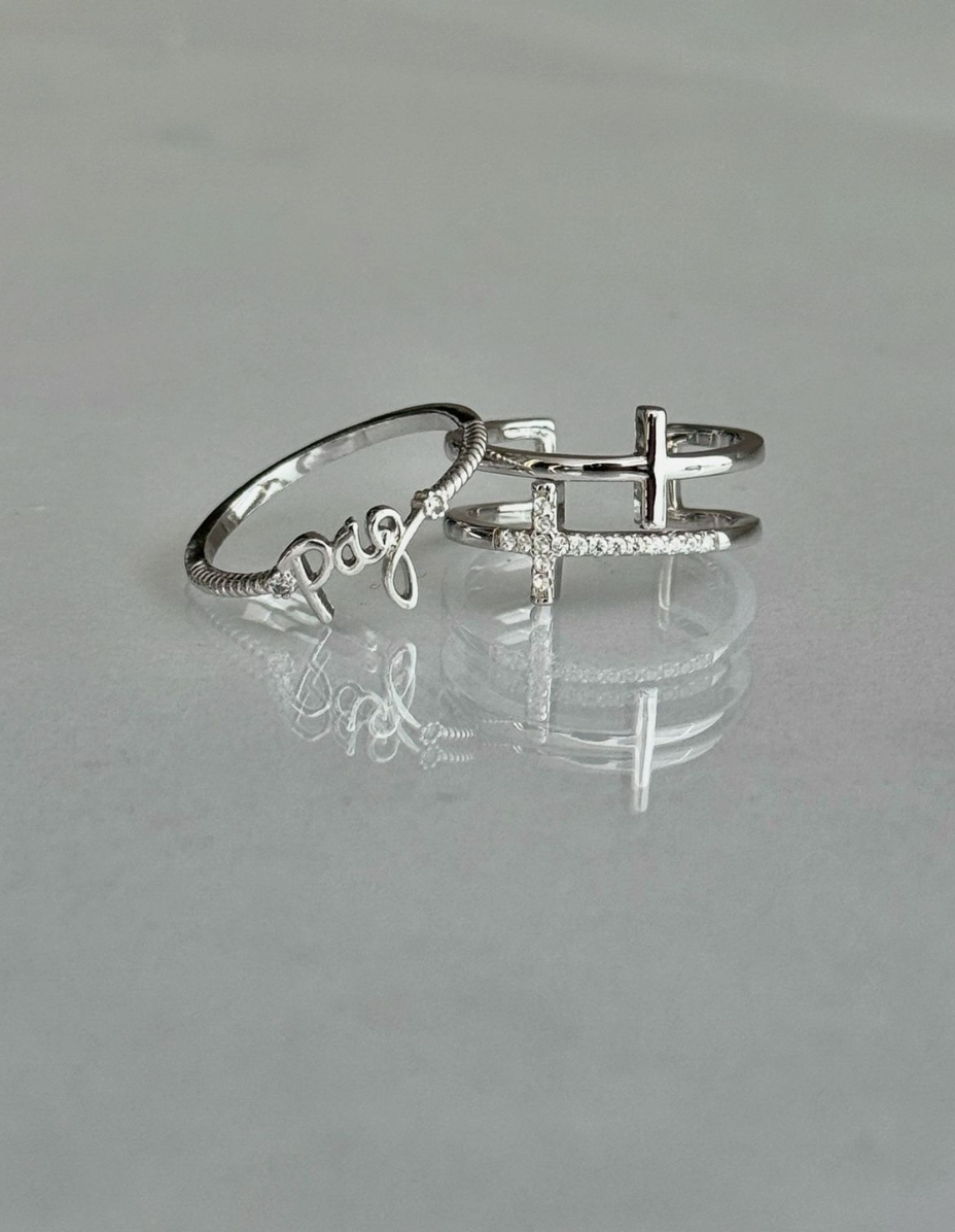 Anel Paz / Dupla Cruz Prata 925 Banho Ródio e Zircônias