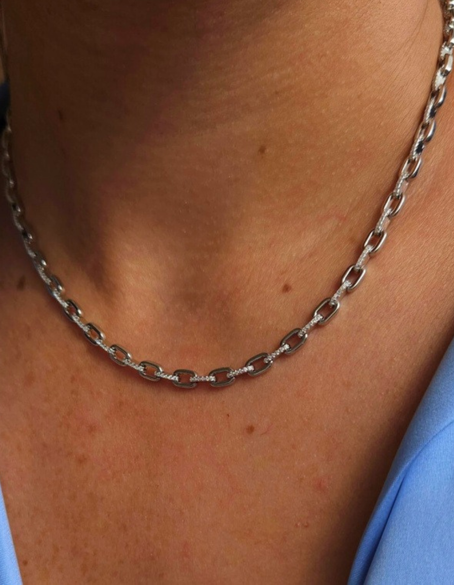 Colar Elos Lisos/Cravejados Prata 925 Banho Ródio e Zircônias