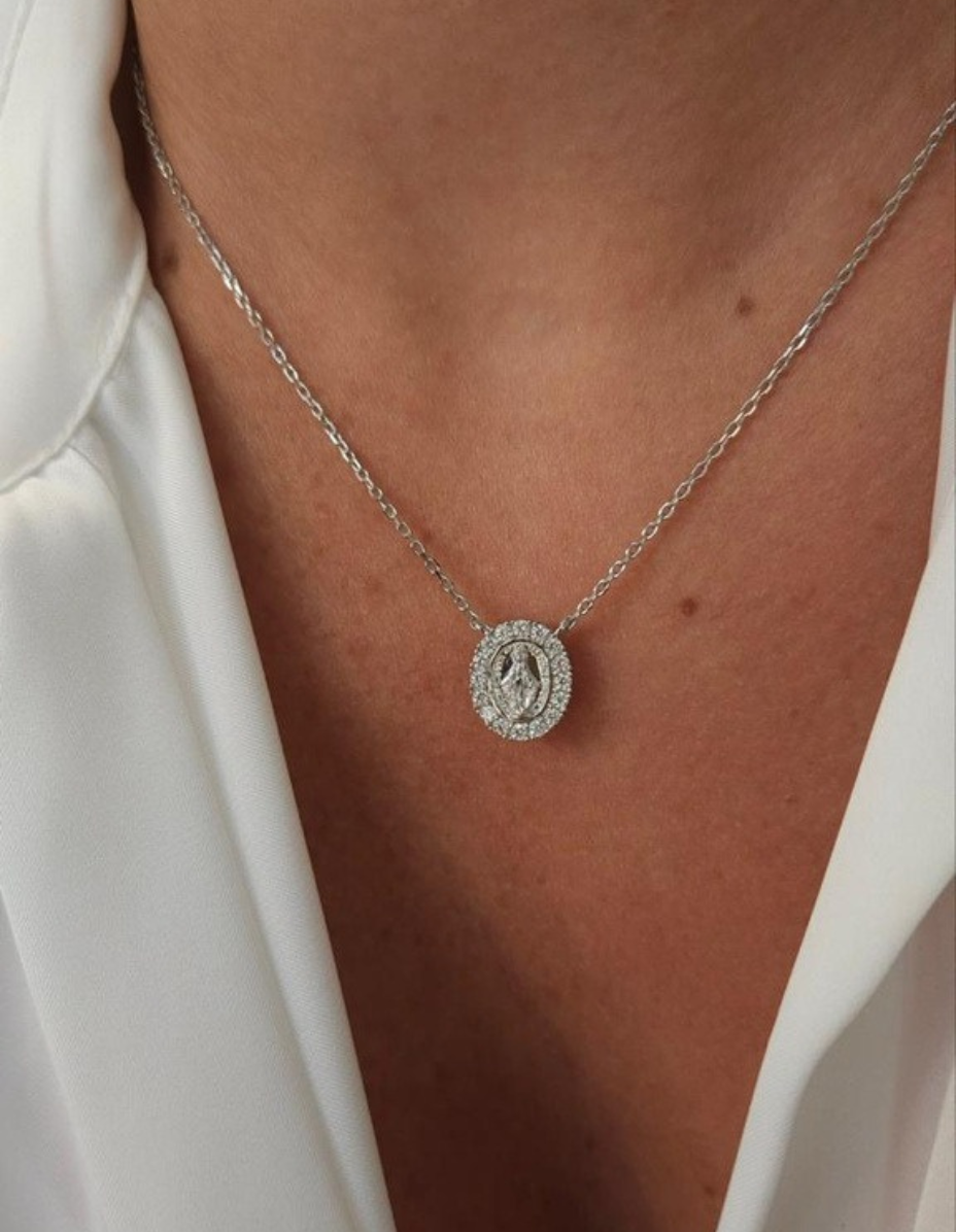 Colar Nossa Senhora Oval Médio Prata 925 Banho Ródio e Moissanite