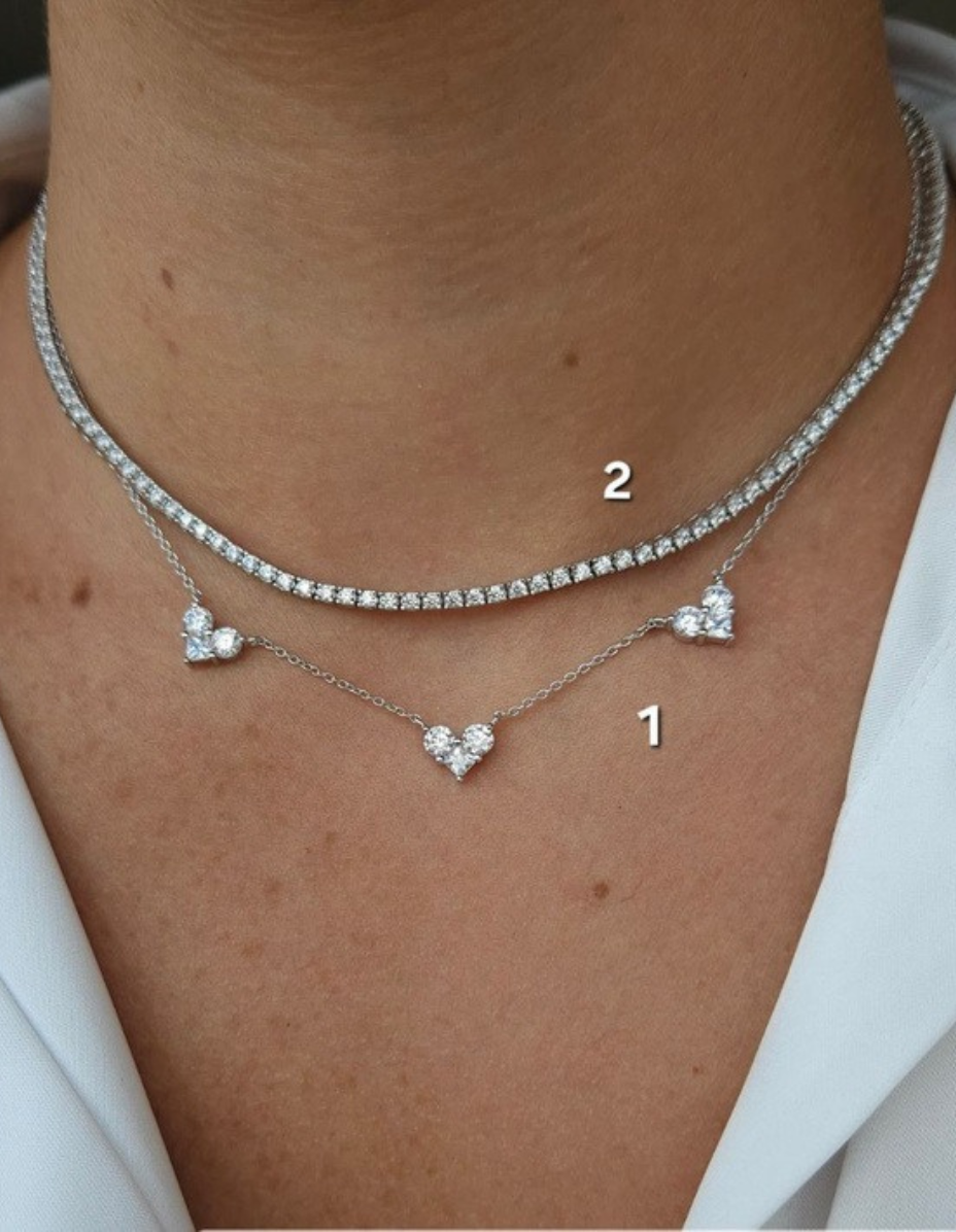 Colar 3 Corações Prata 925 Banho Ródio e Moissanite (1) – Colar Riviera 35cm Prata 925 Banho Ródio e Zircônias (2)