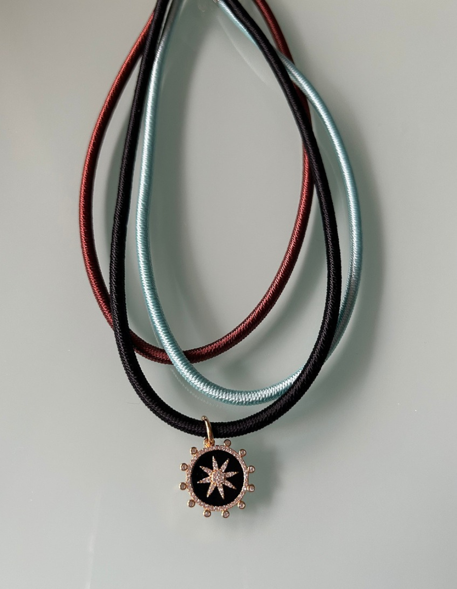 Corrente Seda Azul, Preta e Marrom c/ Fecho Prata 925 Banho Ródio ou Ouro 18k – Pingente Redondo Preto Prata 925 Banho Ouro 18k e Zircônias