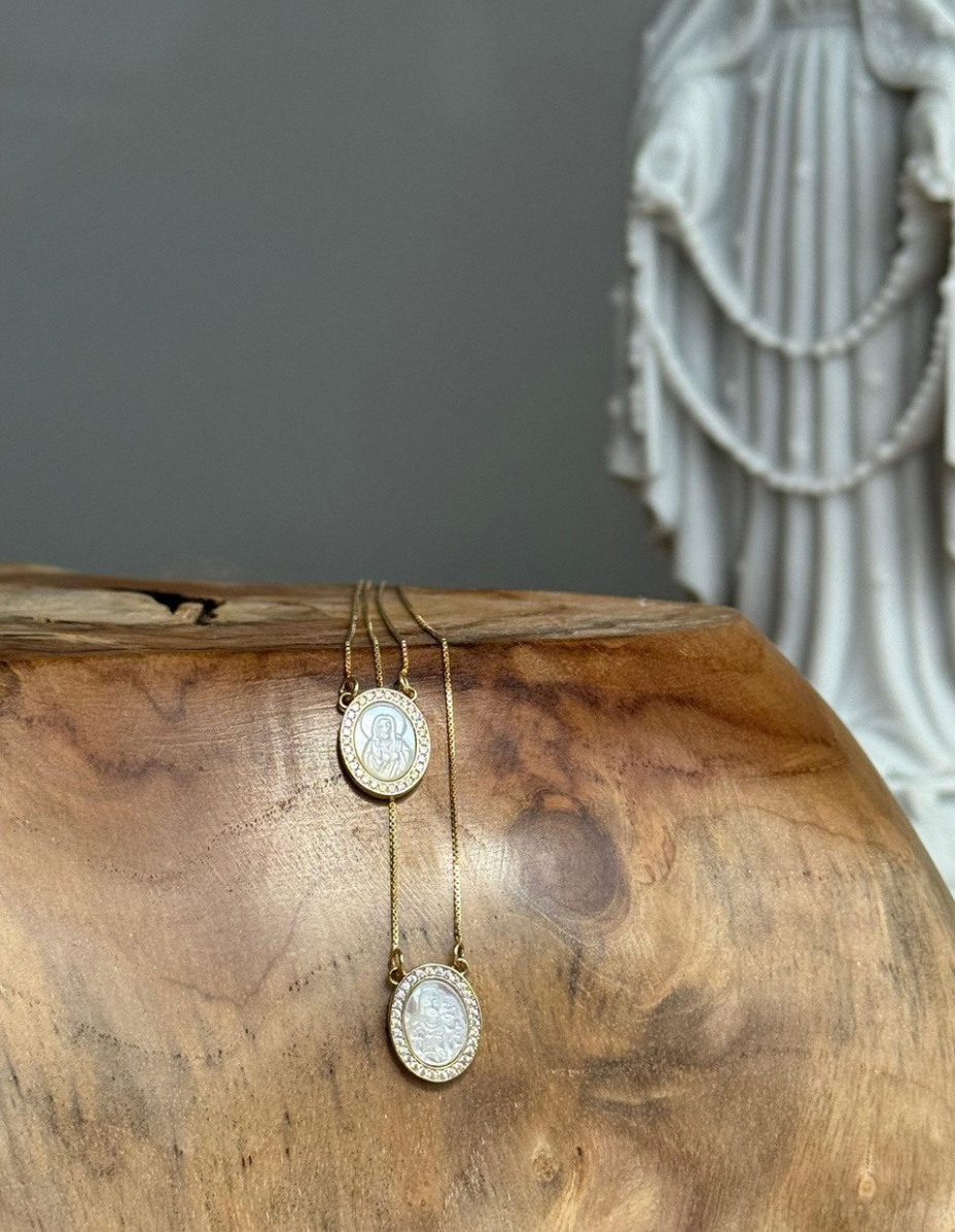 Escapulário Sagrada Família Madrepérola Prata 925 Banho Ouro 18k e Zircônias