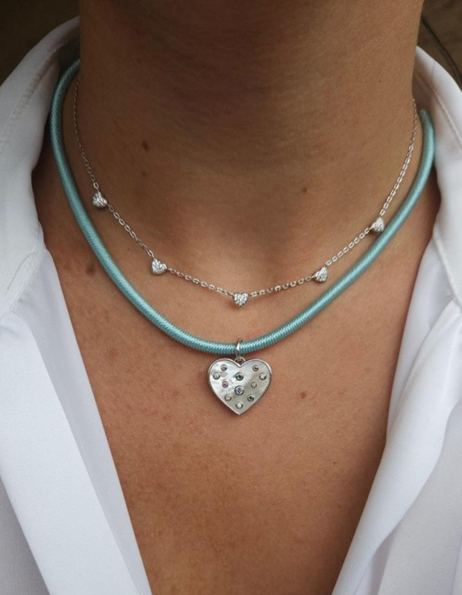 Pingente Coração Pedras Coloridas Prata 925 Banho Ródio – Corrente Seda Azul c/ Fecho Prata 925 Banho Ródio