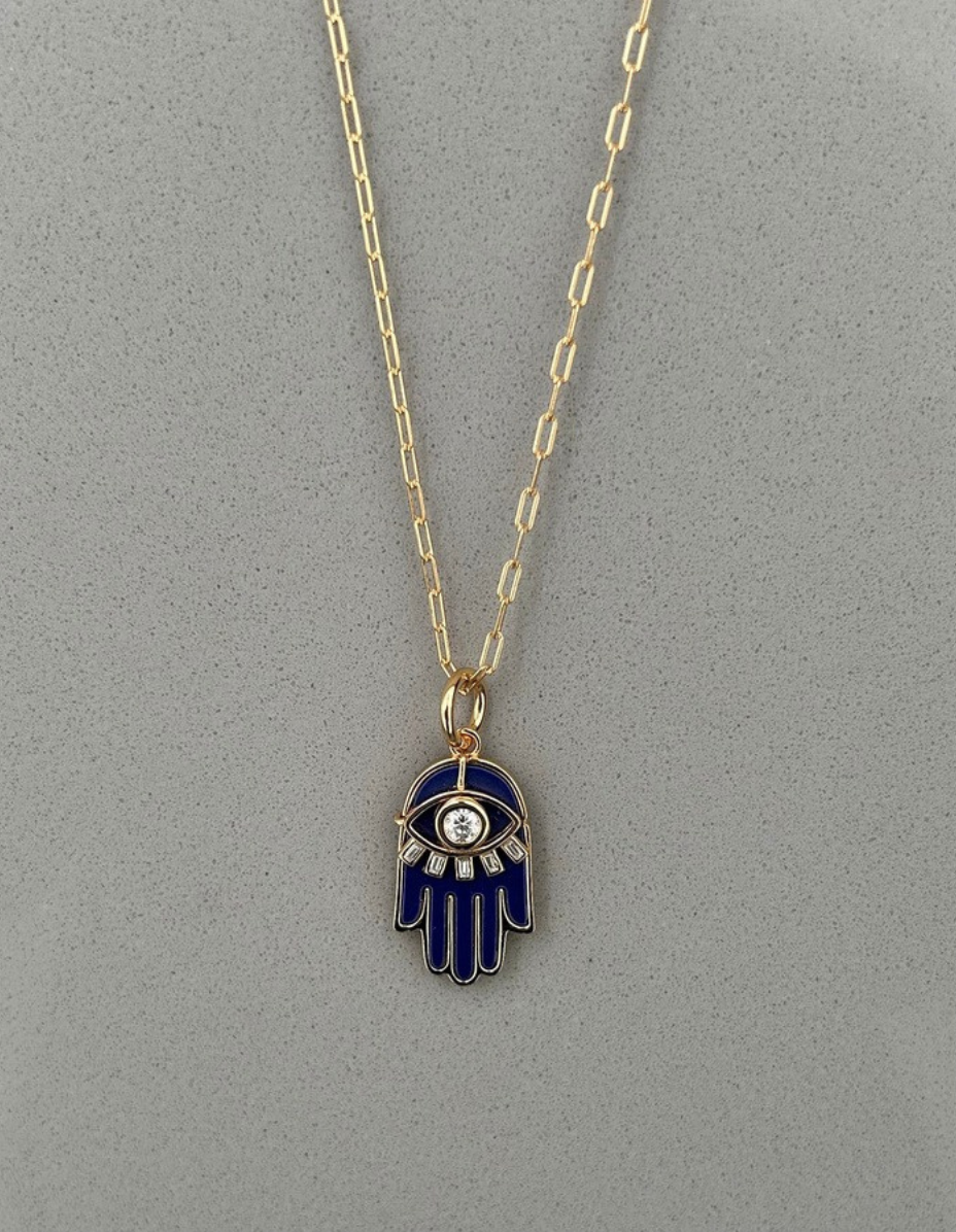 Pingente Mão Olho Grego Marinho Prata 925 Banho Ouro 18k e Moissanite – Corrente Elos Lisa Prata 925 Banho Ouro 18k