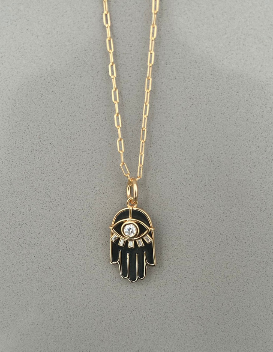 Pingente Mão Olho Grego Preto Prata 925 Banho Ouro 18k e Moissanite – Corrente Elos Lisa Prata 925 Banho Ouro 18k