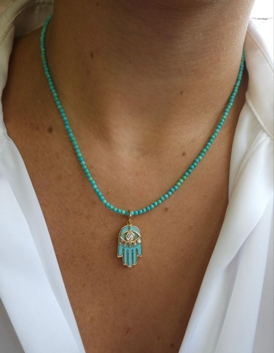 Pingente Mão Olho Grego Turquesa Prata 925 Banho Ouro 18K e Moissanite