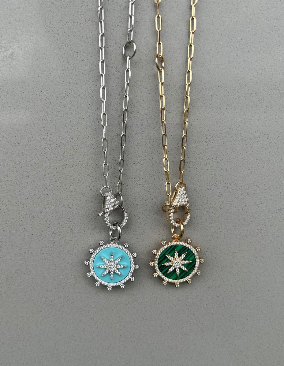 Pingente Redondo Turquesa Prata 925 Banho Ródio e Zircônias – Corrente Elos c/ Fecho Cravejado Prata 925 Banho Ouro 18k / Ródio e Zircônias