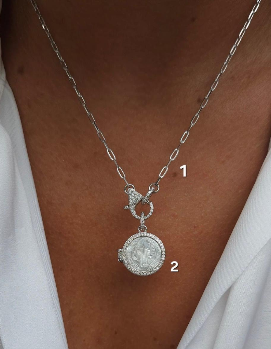Pingente Relicário Nossa Senhora Madrepérola Prata 925 Banho Ródio e Moissanite (2) - Corrente Elos c/ Fecho Cravejado Prata 925 Banho Ródio (1) quantidade